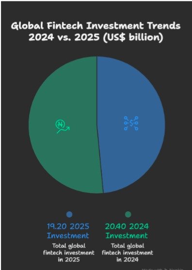 This graph shows that global fintech investment rebounded from US$95.5 billion in 2024 to US$116 billion in 2025, while payments investment remained relatively steady at around US$20 billion, highlighting continued investor interest in core financial infrastructure.